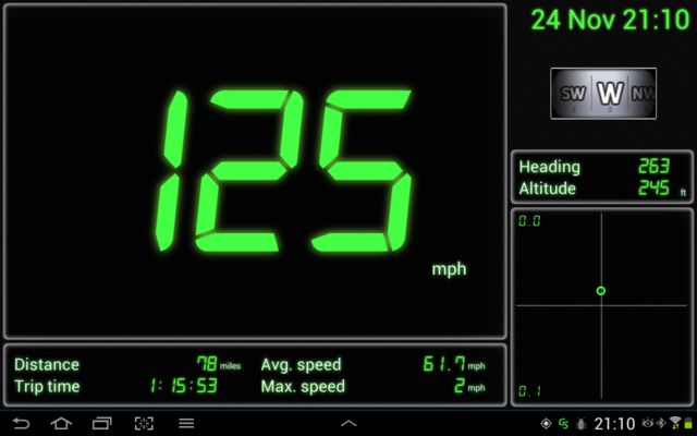 GPS Speedometer is a speedometer application that uses your phone’s internal GPS module to calculate your current speed and display it with large, easy to read, LCD-like fonts.[more] It will also display your total travel time, your average speed, maximum reached speed, your heading and elevation, a nice compass and forward and lateral accelerations. Two versions are available: